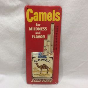 Vintage Camel Cigarette Thermometer. 13 1/2” High. Excellent Condition. In 1913 Richard Joshua "R J" Reynolds, Founder Of The Company That Still Bears His Name, Innovated The Packaged Cigarette. Prior Cigarette Smokers Had Rolled Their Own, Which Tended To Obscure The Potential for A National Market for Pre-Packaged Product. Reynolds Worked To Develop A More Appealing Flavor, Creating The Camel Cigarette.