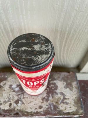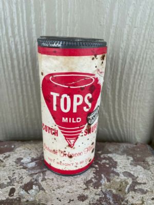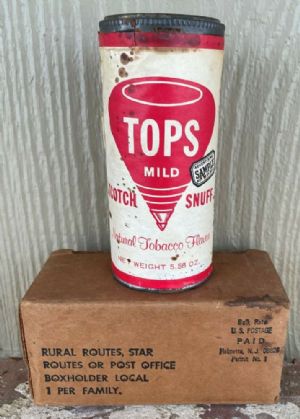 Great vintage, Tops Snuff jar, has never been opened. Box is labeled as an "advertising sample, not to be sold". I actually opened the box to see what was in it. I do not attempt to clean any vintage items. Shows typical age related wear.