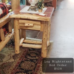 This is an Amish-Made Log Nightstand with a Ball-Bearing Drawer and a smooth finished top. Can be made in Red Cedar, White Cedar, and White Cedar with Hickory.
