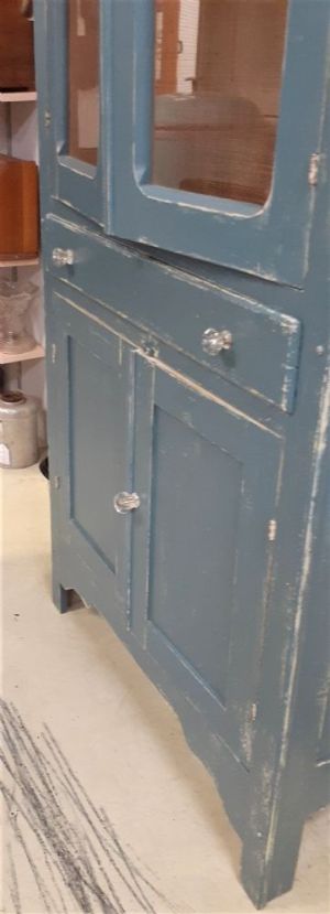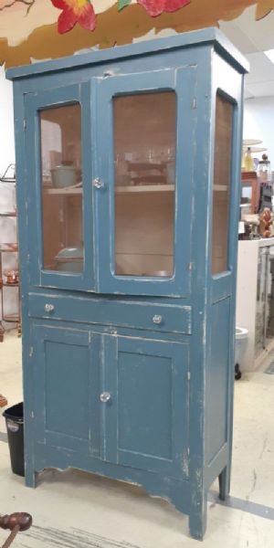Vintage Pie Safe , slate blue, one drawer, two door top and two door bottom with crystal knobs.