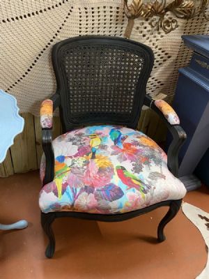 Colorful cane back vintage/antique chair. Painted in flat black paint and upholstered in bright parrot jungle print fabric. Credit Cards/checks accepted. Contact Texas Trails @512-520-7352 for further information on this item.