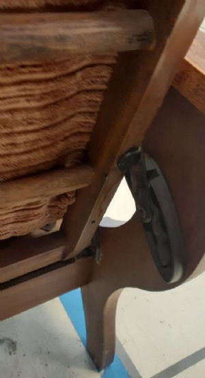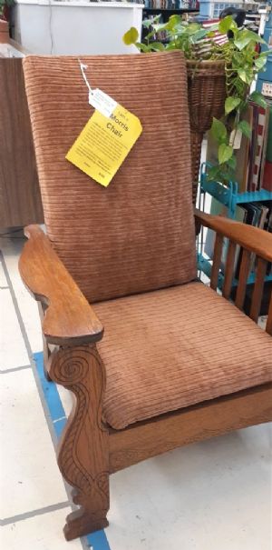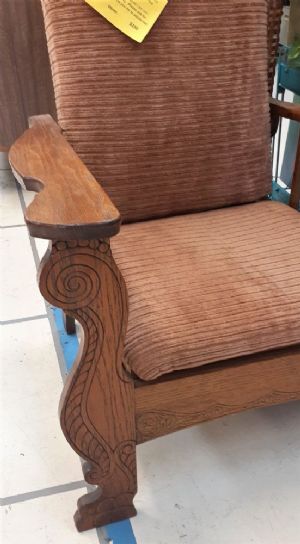The Morris Chair - Early type of reclining chair. This one is probably from early 1900's. Has carved bow arms, carved serpentine detail in wood. Seat and back custions covered in medium brown fabric.