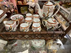 Japan tea set has tray which measures 8 1/2" by 10". Set is in good sahpe-no chips or cracks.