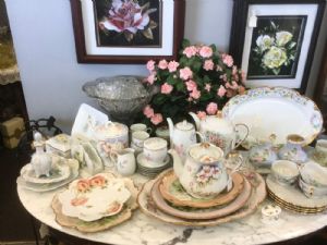 Handpainted porcelain by R Goodman. Platters, teapots, snack sets, cups, saucers and vanity items.