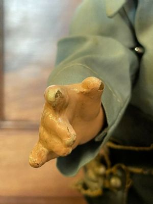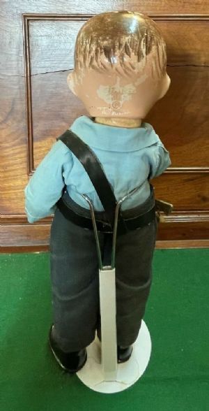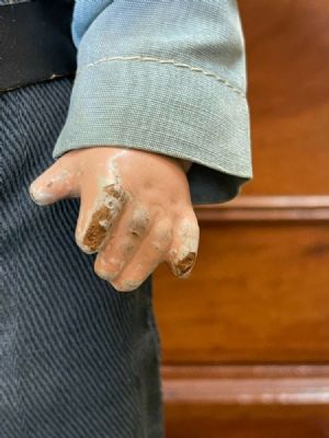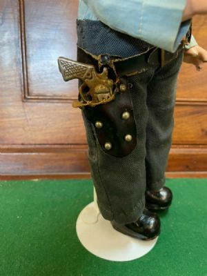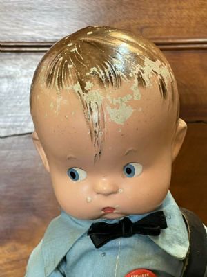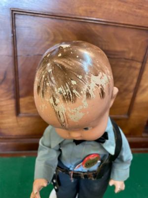 Great vintage 14" Effanbee policeman doll. Has the badge and that other small "item" that is usually missing. Does show typical age related wear. I am not a doll collector so I do not know if this is normal, but the head will move from side to side. It is not loose or detached, this may be normal, I don't know.