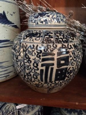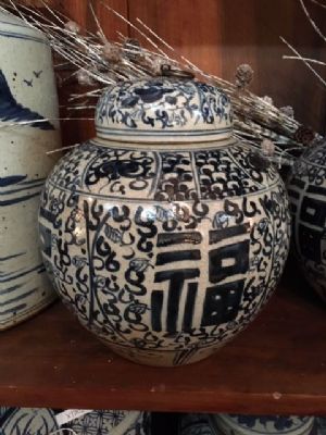 Blue & white jar with lid. Measures 10.5"X10.5" Call store to purchase. (205) 540-1868