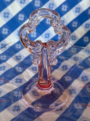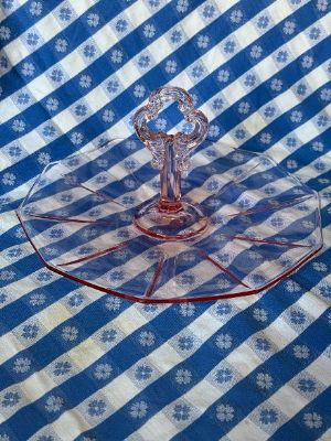 This elegant 10-sided geometric design sandwich plate with keyhole handle, is a stunning piece of vintage tableware, crafted from translucent pink-hued glass typical of the 1930's. This item was manifactured in Cambridge, Ohio which operated from 1902-1954.