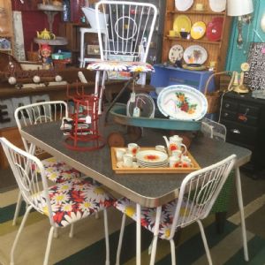 Mid Century Modern Formica top table with 4 chairs. White with clear Formica top. Chair seats covered with floral pattern of daisies on navy blue pattern.