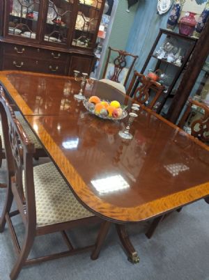 Vintage Henredon set is in excellent condition! This is a double pedestal table in beautiful condition. The set includes six upholstered seat Chippendale style side chairs. Must see in person to appreciate! See it in person at: Marietta Antique Mall (Space 500) 1427 Roswell Rd Marietta 30062 Call 770.973.5600 to puchase by phone for local pick up.