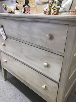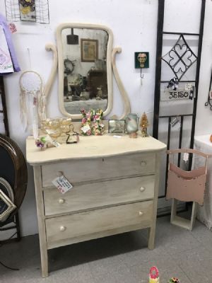 This adorable 3 drawer antique dresser and mirror has been painted in a cream color and sealed with a medium stain over the top of the paint. In very good shape and a great price! Call store to purchase (256) 346-2023