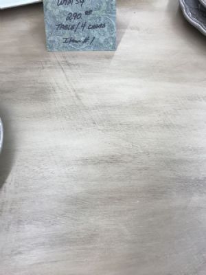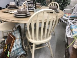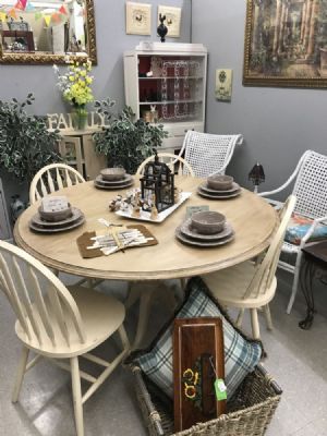 This large round table has four cream colored chairs to match the cream colored base of the table. Top of the table has been sealed with a medium stain over the top of cream paint.Call store to purchase (256) 346-2023