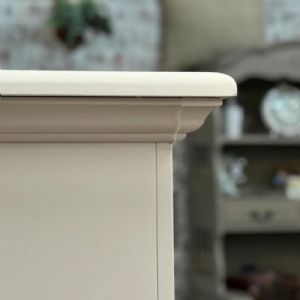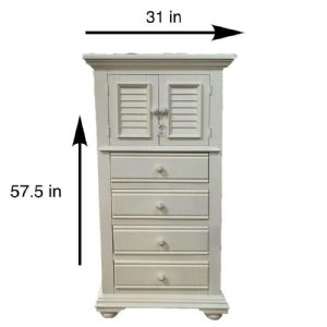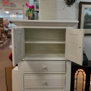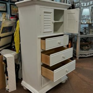 White tall narrrow wooden cabinet designed to be a lingerie cabinet, but could be used for nursery cabinet, kitchen cabinet, or other uses.  57 x 31 inches