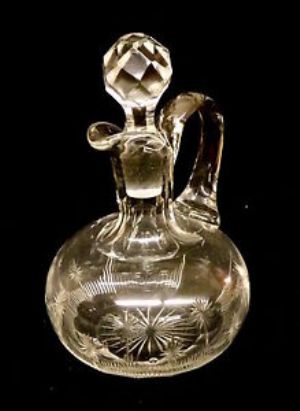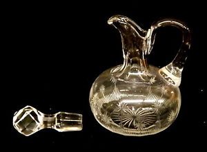 Here is a lovely American Brilliant Period cut glass cruet featuring a Prism and Star pattern dating to about 1880. Overall measurement is 6" to the top of the faceted stopper.  While is rarely possible to be a hundred percent sure whether the stopper is original, I do believe this one is as it fits perfectly and passes the quarter turn test.  The cruet itself has a graceful applied handle and no sign of interior hazing.  Condition is water clear and perfect noting only some minor superficial contact scuffing on the exterior and a tiny spot of roughage at the base of the stopper...neither much of an issue, but mentioned for the sake of complete accuracy.