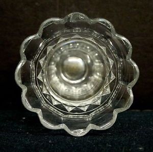 Here is a fine early Anglo-Irish cut glass sweetmeat or jelly glass dating to about 1820. It has a deep wide polished pontil, good honest bottom wear and a sweet flint tone when taped. Measuring 4" in height,it has a bit of roughage at two of the upper scallops, but is otherwise in perfect condition.