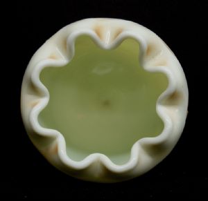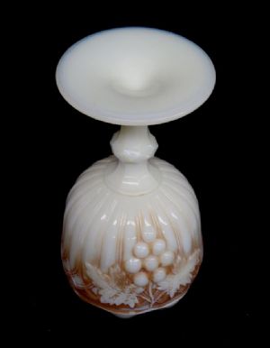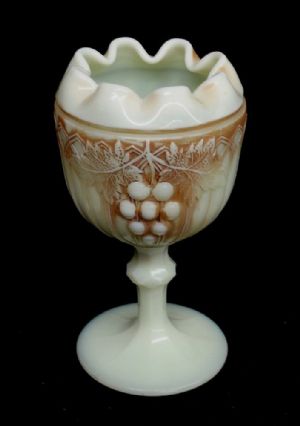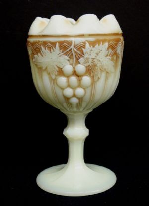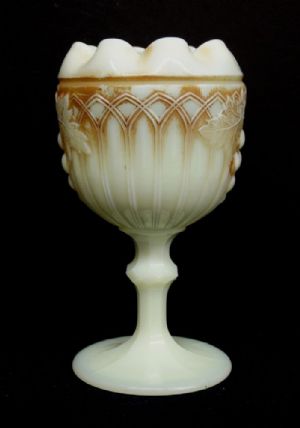 Here is a Northwood Grape and Gothic Arches custard glass with nutmeg stain footed rose bowl dating to about 1905.  Measuring 6" in height, it is in perfect condition.