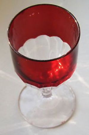 Here is a ruby stained Victorian pressed glass goblet in the "Plain Miotin, Red Top" pattern attributed to Mckee and dating to about 1880. Measuring 6" in height, it has a few typical pinprick skips in the staining (remains about 98 percent intact) but is otherwise in perfect condition.