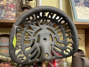 All original old cast iron implement or tracotr seat. Has a cut out design showing the manufactor as Parlin & Orendorff Co of Canton, Illinois. The seat is raised in the middle and center of seat so one could attach the seat to the tractor or other farm equipment.