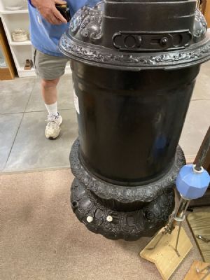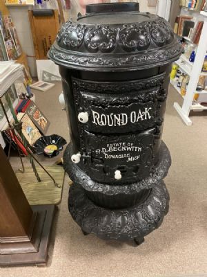 This round black stove has been repainted with advertising name"Round Oak". It is a clean, neat piece-measuring 22"wide and 42" tall.