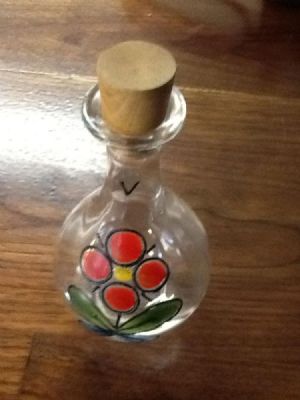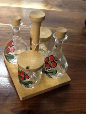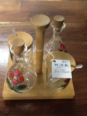 This 1950's Oil and Vinegar and Salt and Pepper Caddy is a beautiful piece. Vibrant colors and labeled V and O for the oil and vinegar is so pratical.