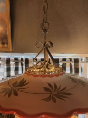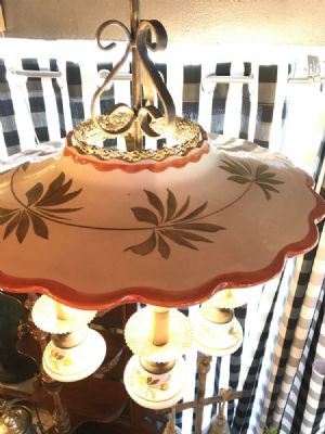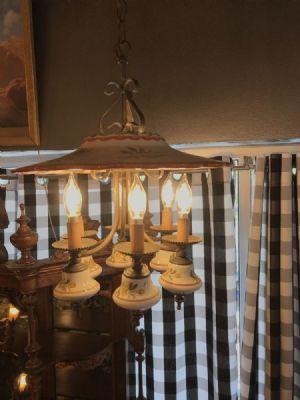 1930's vintage hand painted ceramic chandelier, great cottage or French look. Pierced hand stamped brass banding and brass finials. 6 lights, shown using 65 watt bulbs. Glass chimneys can be used with bulbs, shown here without. Muted colors of greens, rusts and oranges on cream background.