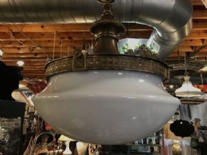 Antique American 1870s-1890s Single extra large pendant chandelier. Beautiful Satin milk Glass Globe and beautiful stamped Brass holder, chain and canopy. Requires one large special order bulb equivalent to 100-150 Watt. Globe hinges on holder to drop down to change bulb. All original fixture, new wiring. Globe Approximately  24 inches diameter and height is 66 inches from ceiling mount to bottom of globe.