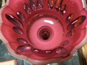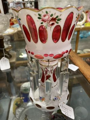 Lamp is 8 1/2" tall. The white background makes the cranberry glass dots attractive. Roses decorate the lamp.