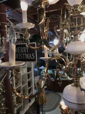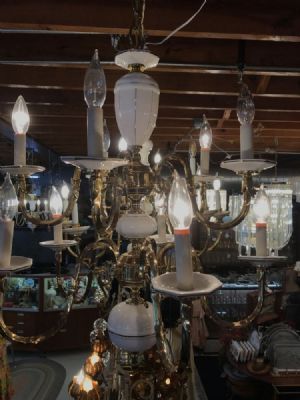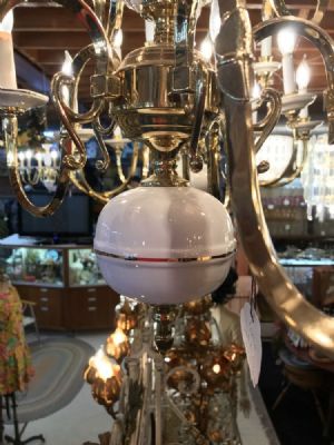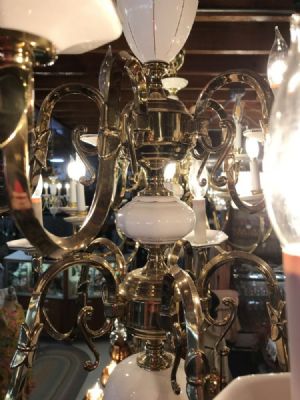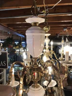 1950's Classic style creamy white porcelain and brass chandelier. 10 lights on 2 tiers, shown with 65 watt LED bulbs. Adjustable height chain included. Chandelier height without chain approximately 24", 2 ft chain, width approximately 24"