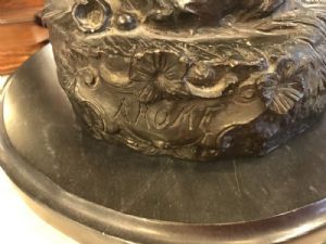 Signed Moreau, Late Edwardian 1930-1940s Bronze Lamp. "Flower Girl" Bronze Sculpture Lampafter. French Wax cast bronze accent lamp. Originally cast by Augusta Moreau. Sculpture is of a young girl enjoying flowers holding 3 iridescent "favrile-style" shades. Patinated Bronze and copper mounted on a green marble base. "AROME" (a nymph) is incised on front and by "A. Moreau" is incised on the side. Measures 34.5 " High and marble base is approximately 14" in diameter. There's a switch on cord. Use maximum 25 watt bulbs, requires 3.