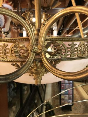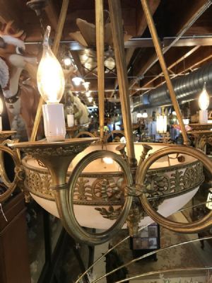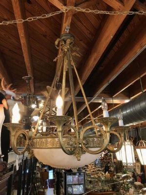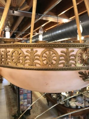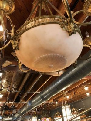 Antique French Alabaster Hunt Scene Chandelier. 1870-1880 circa. Beautiful alabaster bowl surrounded by doré bronze detailed banding and hunt styled horns along with boar heads. Beautiful ribboned canopy. Uses 65 watt bulbs or equivalent, this is a European fixture so the light sockets are European wired, comes with the adaptors for you to use American Bulbs. Requires 12 bulbs.