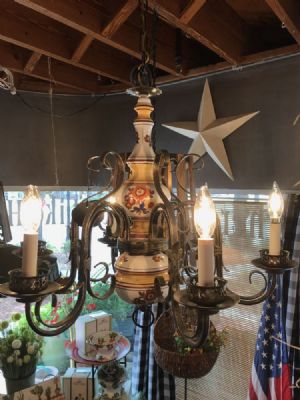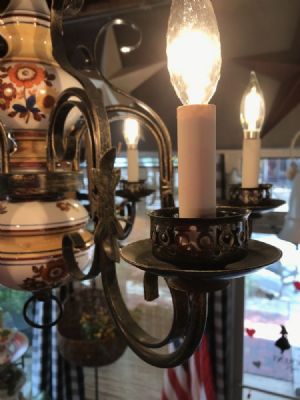1940's vintage Hand painted on porcelain in tones of blues, rusts, mustard, golds, cranberry and orange on cream background. Antique brass finish on hand wrought arms and hand stamped brass banding. 6 arm lighting, shown using 65 LED bulbs. Can be used with clear glass chimneys on bulbs.