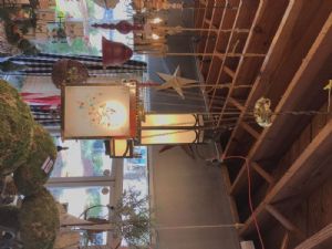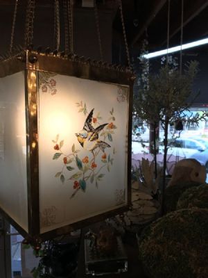 1915-1920's Hand painted glass panel chandelier. Stamped brass and chain. Uses one bulb, 65 watt or equivalent LED bulb. Please see all scenes of fixture.