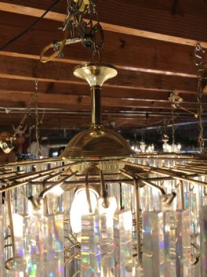 1950's original 4 tier gold tone frame. Accommodates 5 chandelier bulbs of 45-65 watt or equivalent. Adjustable chain. Approximately 27" in height and approximately 46" in diameter.