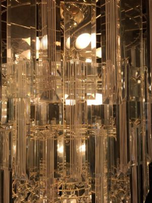 Fabulous late mid century extra large chandelier. A mix of glass and lucite prisms. Gold tone frame and chain. 4 tiers of light bars. 14 bulbs requiring 45-65 Watt chandelier bulbs or equivalent LED's. Chain height adjustable.