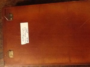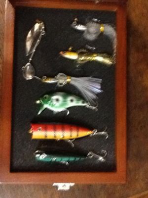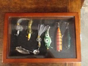 This Cherry Display Case featuring Vintage Lures is ready to be hung on the wall.
