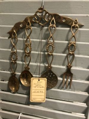 BRASS SPOON AND FORK WITH WALL HOLDER