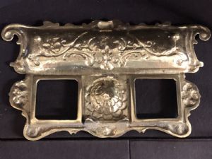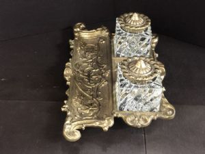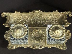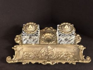 Vintage (1951) Virginia Metalcrafters Colonial Williamsburg Reproduction. The company's hand casting and finishing methods were the same as those used to form the orignal antiques. Company in business 1890-2005. The brass double crystal inkwell holder measures 11-1/2" long, 6-l1" tall. The crystal bottles with brass tops measure 2-3/8" square. This stunning brass desk set has art nouveau shapes and floral/scroll designs. This piece is in excellent condiiton with no scuff marks or scratches. Inkwell bottles show no chips or cloudiness. An awesome show piece for sure!