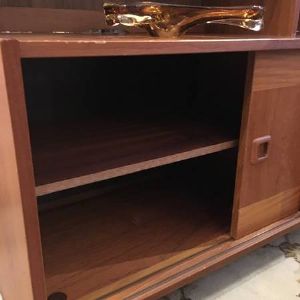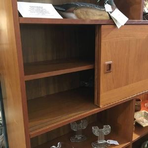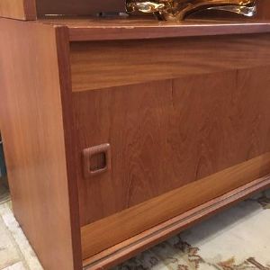 Beautiful Danish Modern wall unit-teak finish,adjustable shelves, sliding door storage. This piece has it all. True MCM Domino mobler design. Two pieces makes it easy for moving.