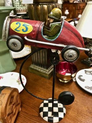 Novely race car on stand.