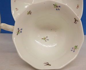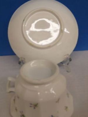 Here is a pretty soft paste porcelain cup and saucer dating to about 1840. This is decorated all over in a delicate multicolored sprigged enameling. The cup measures 2 1/2" in height. It has a bit of gravelly frit on the inside bottom...bits of undissolved bone ash typical of these early soft paste pieces. The saucer is 5 3/4" in diameter. Both pieces are in perfect clean condition.