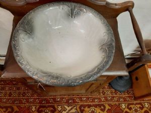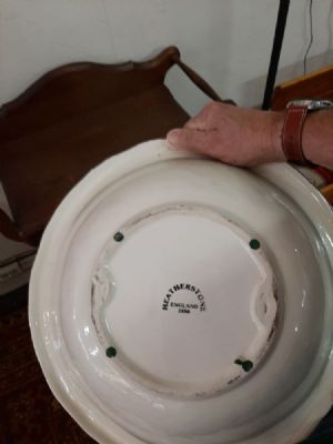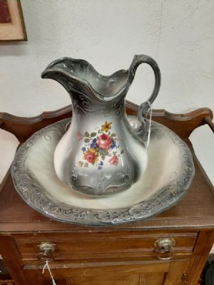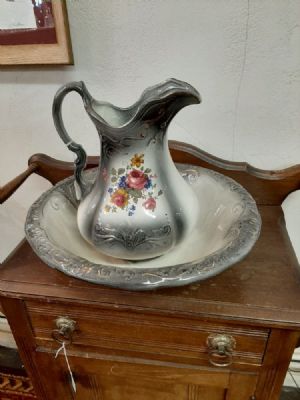 This is a beautiful Pitcher and Bowl set made in England. It stands 13 inches tall and16 inches wide no chips or cracks very nice.