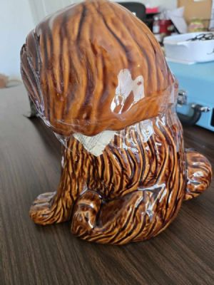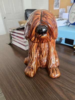 A 1960 DORANNE OF CALIFORNIA SHEEP DOG COOKIE JAR. UNIQUE STYLE FOR STORING TREATS FOR HUMANS OR PETS.