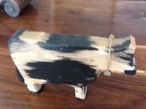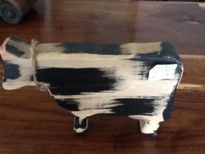 This great standing wood cow is a must for any primitive collection. Complete with bell around the neck!