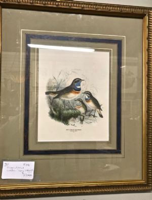 Beautifully framed and matted original stone lithograph. white spotted bluethroat.