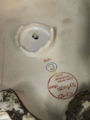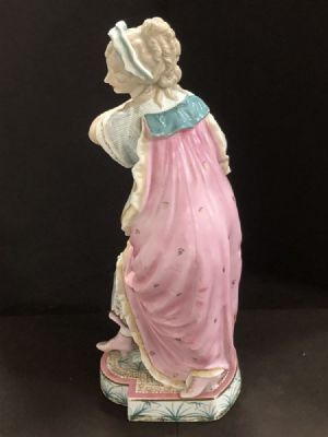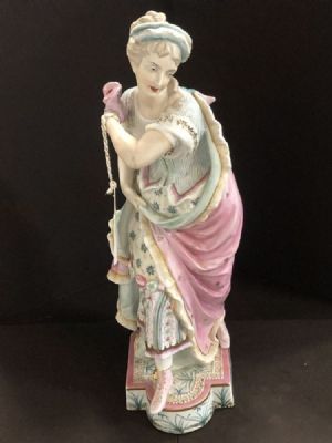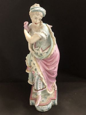 Bisque figure of lady dressed in 18th Century Dress holding a mask.  Base is 10-1/2" x 6-1/4", she is 21" High.  Made by the Sylvan China Co. in Japan.  Imported by the Continental Merchandise Company, in the early 1950s.  She is is excellent condition, no chips or cracks.  Shipping will probably be around $50.00.