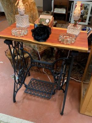 Cedar Wood Top Singer Iron Base Table.  Nicely made.  Layaway available, credit cards/checks accepted.  Texas Trails Antiques and Marketplace, Smithville, TX.  Call or text 512-520-7352.
