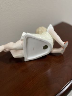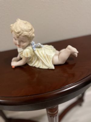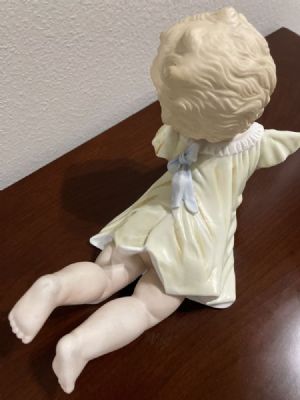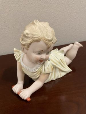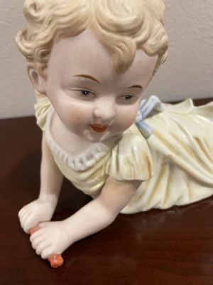 Piano Baby. Andrea by Sadek. Baby lying on her stomach. Porcelain. Bisque finish. Pale yellow dress with blue bow.