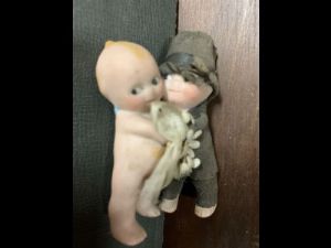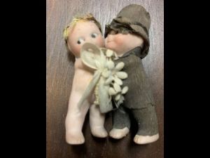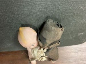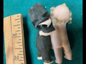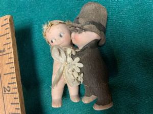 Miniature bisque joined Bride and Groom figures, only 2" tall. Made in Germany c: 1925. Crepe Paper clothing. Note head wreath.