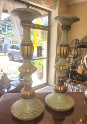 Set of 2 Green and Cream Candlesticks. 16 inches tall. Will calculate shipping with purchase.