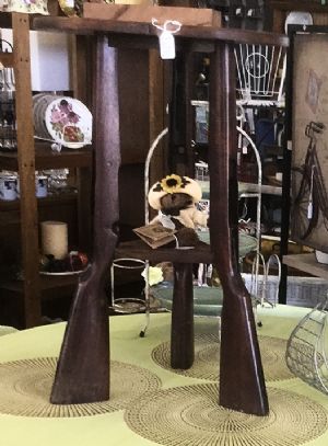 Occasional wooden table with legs made from gunstocks. Brown. Round circular top. 28 1/2 in tall and 18 in diameter.
